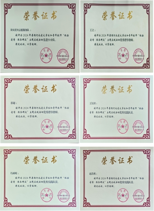 近日,由电子科学与控制工程学院师生组成的防灾星火志愿服务队,获评2024年河北省“体验省情·服务群众”主题社会实践活动先进小分队,王立、郭越两名教师获评实践活动优秀指导教师,王钰田、冯雨晴、赵浩然三名学生获评优秀实践队员。