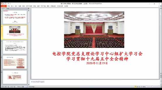 11月19日晚19:30-21:00,电子科学与控制工程学院钉钉线上开展党总支理论学习中心组扩大学习会,学院党总支委员、各教研室主任、各支部书记、两办人员、教学秘书参加会议。