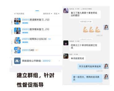 王晓宇老师作为200512班的班主任,在一一排查了解全班同学学习状况后,分类确定了重点帮扶的学生,在向辅导员反馈后。向学院党政领导做了汇报,然后建立了不同课程学习困难的学习群和帮扶小组,开展有针对性的帮扶指导,鼓励学生建立信心同时,每天督促学生学习、打卡。