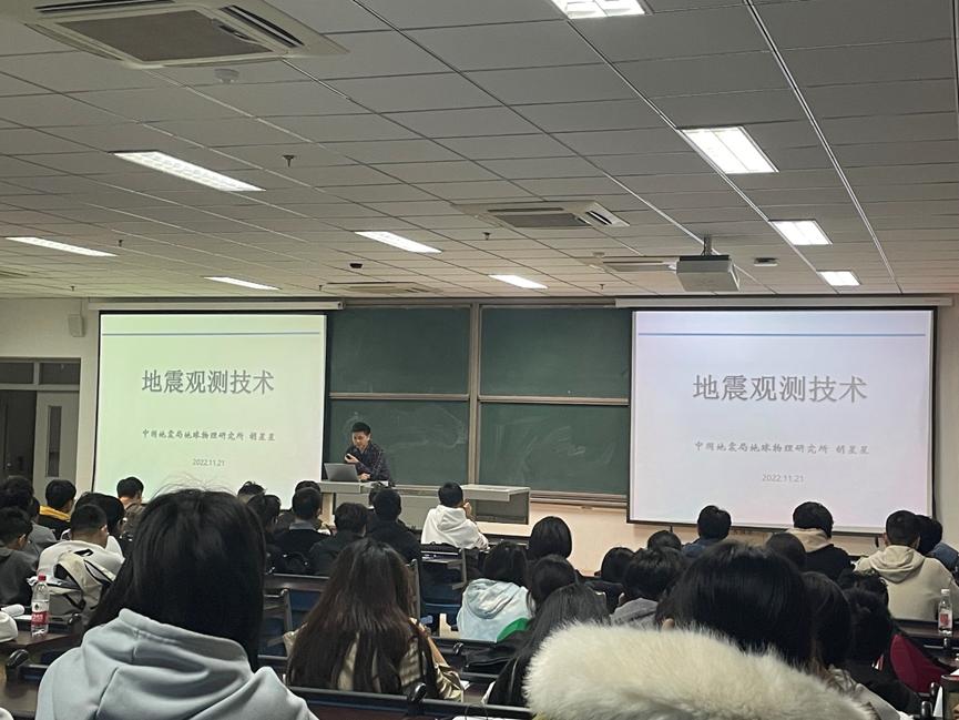 11月22日,中国地震局地球物理研究所研究员胡星星应邀为学校师生作主题为“地震观测技术”的学术报告。报告会由电子科学与控制工程学院吴燕雄主持,测控技术与仪器专业全体大一新生和部分老师到场聆听。
