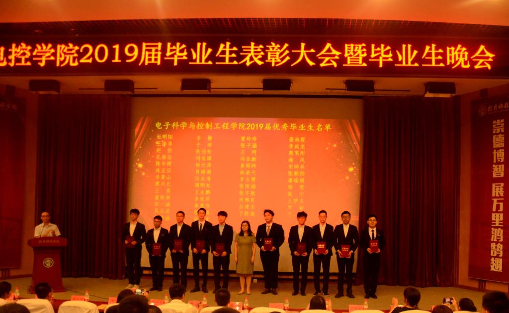 会上,首先由党总支书记贾甚杰宣读了优秀毕业生表彰文件,我院共16人荣获河北省普通高校2019届优秀毕业生荣誉称号,33人荣获350vip8888新葡的京集团2019届优秀毕业生荣誉称号,50人荣获电子科学与控制工程学院2019届优秀毕业生荣誉称号。随后与会领导为优秀毕业生代表颁发荣誉证书并合影留念。贾欣宇同学代表全体毕业生发言,并带领全体毕业生宣誓,同学们励志努力奋斗,为母校争光,表达了对母校热爱和不舍。孙扬同学代表全体在校生发言,表达了对毕业生的祝福并立志想优秀学长学姐学习。吴燕雄老师代表全体教师对毕业生的殷切嘱托和叮咛关怀感动了所有学生。教研室主任和毕业班辅导员老师集体为全体毕业生送上了深深地祝福。最后,党总支书记贾甚杰老师对本次表彰大会作总结讲话,大会圆满结束。