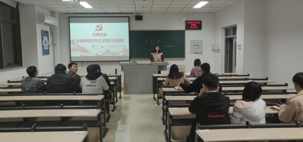 随后,李红豆同学与大家分享了学习《“两步走”发展战略》的心得,他讲到:“两步走”的第一阶段是指:从2020年到2035年,在全面建成小康社会的基础上,再奋斗15年,基本实现社会主义现代化。第二阶段是指:从2035年到本世纪中叶,在基本实现现代化的基础上,再奋斗15年,把我国建成富强民主文明和谐美丽的社会主义现代化强国。