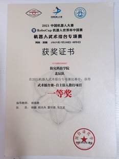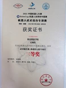 7月30日至8月1日,新葡的京官网电子科学与控制工程学院学生于“2021中国机器人大赛暨RoboCup机器人世界杯中国赛”中喜获佳绩,其中,北辰队(杨爽、 郝汛舟、雷付路、马文武)获得武术擂台赛-自主仿生机器人散打项目国家级一等奖、定倾队(郝汛舟、夏仲言、杨爽、牛聪仁)获得武术擂台赛-体感仿人格斗项目国家级三等奖;乘风队(周圣喆、贾宇静、潘佳伟、裴椿铭、杨鲜)获得舞蹈机器人-表演项目国家级三等奖。