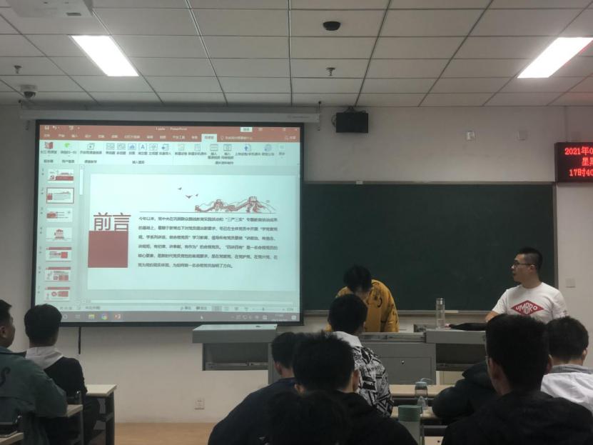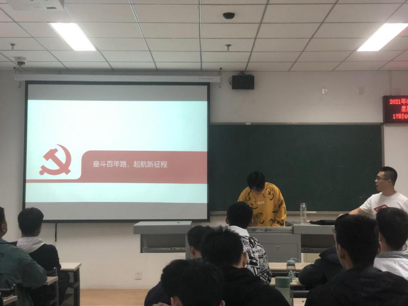 值此建党一百周年之际,180525班团支部为响应号召,深入学习贯彻党的十九大精神,学习中国共产党的光荣历史,于2021年4月10日下午5时,在天仪楼208教室举办了“奋斗百年路,启航新征程”主题团日活动,本次团日活动180525团支部全员参与,并特邀韩智明老师出席指导。
