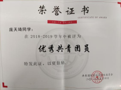 她入学之后勤奋好学,保持良好的学习习惯,并取得了优异的成绩。她积极参加学校内组织的活动,曾获第十一届“健康杯”排球比赛新生组第一名。她在工作和学习方面都表现出了极高的热情,并在2018-2019学年中被评为优秀共青团员,这些成绩都是对她努力的一份肯定。(获奖证书1、2)